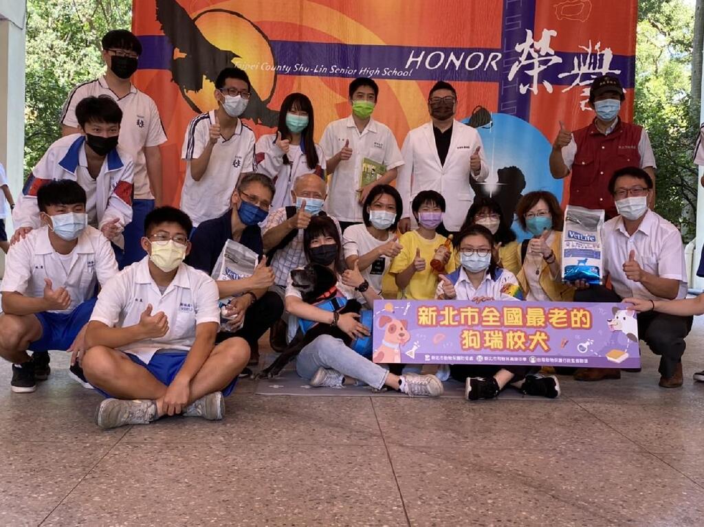 今日是9月9日台灣狗狗節,為讓動物保護觀念從小扎根,新北市政府動保處持續推廣校園犬計畫,現已有50所學校,共計95隻校園犬貓,並持續推廣寵物長照政策,目前獲認證長照機構數量為全國最多,讓新北市老年犬貓都能享有像人類一樣完善的長照服務。動保處特別在昨(8)日「狗狗節」前夕,與台灣動物保護行政監督聯盟理事長王唯治及世界愛犬聯盟台灣總代表呂幼綸前往樹林高中,訪視全台最年長校犬「小黑」,並請長照動物醫院獸醫師為牠健康檢查及送上護具、保健食品、飼料,希望「小黑」健康九九。