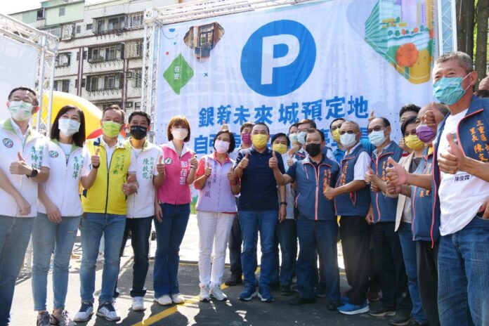 新北市長侯友宜今(10日)主持銀新未來城預定地自強臨時平面停車場啟用典禮;侯友宜表示,銀新未來城正辦理都市計畫變更中,因此為善用土地、發揮地利,市府團隊努力合作在預定地闢建臨時平面停車場,提供216格汽車停車位、105格機車停車位,即日起試營運一個月,讓民眾免費停車,享受生活立即的便利。