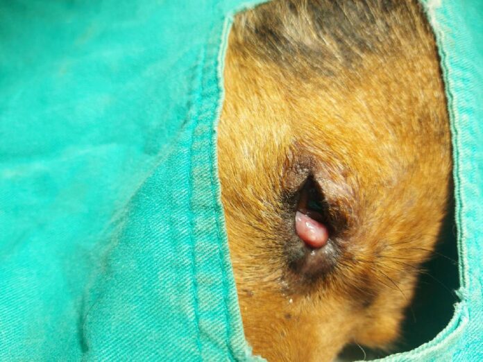 獸醫彭明發表示,常見犬隻淚腺產生膨脹或滋長紅色肉質塊如蓋子突出,俗稱為櫻桃眼。當淚腺體突出或是外翻時,潮濕的組織暴露於空氣受到外部刺激,例如爪子,就會導致腺體的血液供應中斷。這種敏感第三眼組織經常會導致繼發性炎症、腫脹或感染。此外,櫻桃眼於眼角內部看起來像一個紅色腫塊,紅色肉塊組織看起來很像櫻桃外觀,才會有外界俗稱做「櫻桃眼」的病名。這種狀況並不會導致動物感覺疼痛,從外觀角度來看,它可能礙眼不美觀,倘若這種情況持續下去,會干擾眼睛正常眼淚的滋生。
