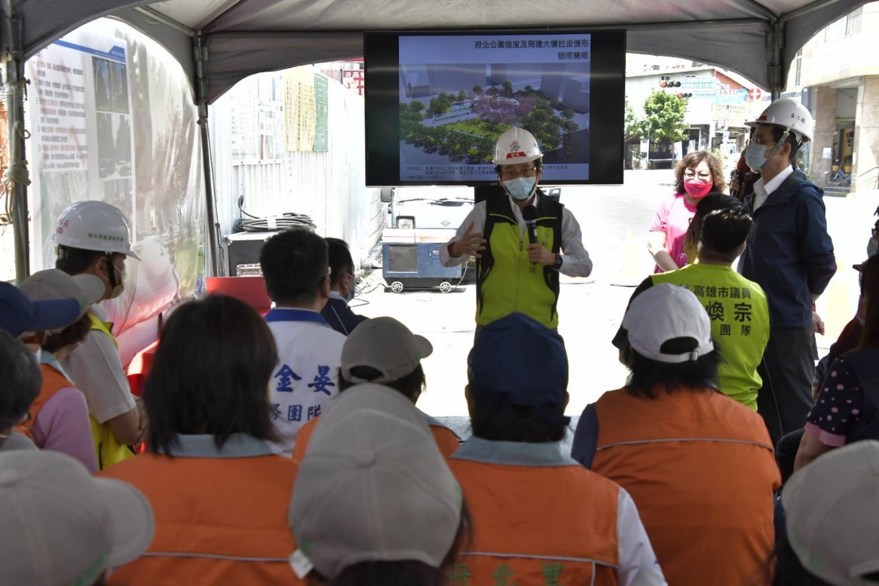 養工處進一步說明,府北公園是以「綠活、璀璨、翻轉、新生活」四大方向規劃,開闢後將成為鹽埕區再生典範。現地改建後的公園,設置有陽光滿佈的大草坪,並栽植樹形優美的開花性及遮蔭喬木,街角開放性廣場設計,並由無障礙動線引導民眾進入遊戲場、藝術水景及造型涼亭休憩區,開闊地空間及明亮、通透的視野,提高使用者親近性公園設施,同時兼具防災救難的功能。公園開闢進度目前約達66%,已將原建物地下室打除,並回填土壤至平面層,佈設公園水電等管線及水景池結構體,並陸續施作地上設施物。為減少施工對環境及居民的影響,已要求施工廠商於施工期間,不定時灑水抑制揚塵、縮短工作時程以降低噪音,加強公共安全措施。