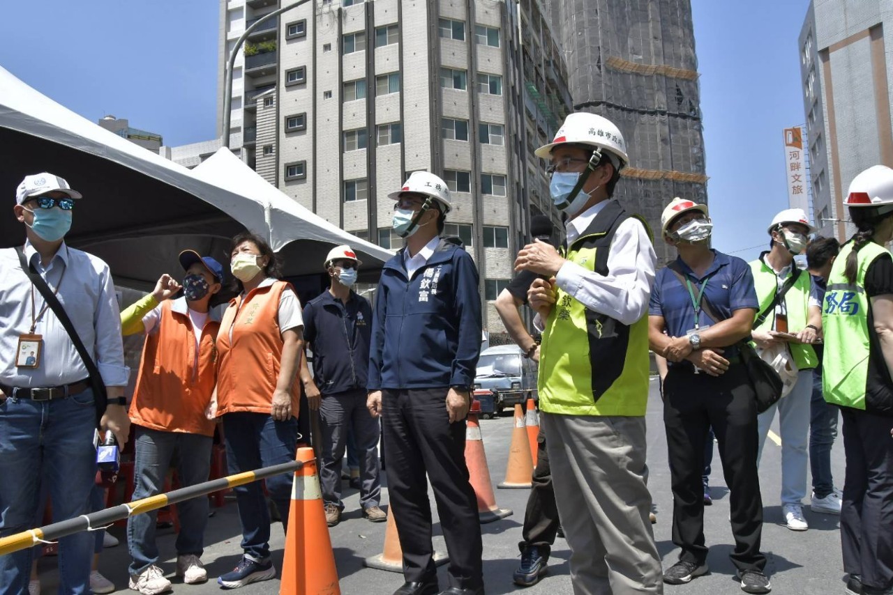 鹽埕區城中城危樓拆除已於今年5月20日完工,市府規劃原址開闢為府北公園,工程接續於6月1日開工,施工進度持續超前,周邊6棟老舊建物立面拉皮作業亦於6月8日同步進行。副市長林欽榮今(14)日視察施工情形,除了解各項工程施工執行狀況,亦提醒養工處、都發局及施工團隊須兼顧施工品質及效率,並應加強落實施工安全維護管理。