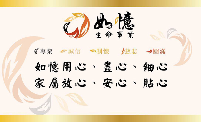 『如憶生命禮儀』提供專業可靠的諮詢,全程溫暖陪伴在家屬左右,從旁支撐家屬在悲痛中好好處理摯愛的身後事,用心傾聽家屬的需求,傾盡全力圓滿每一位家屬的託付,是『如憶生命禮儀』責無旁貸的使命,我們視生命禮儀為一項神聖的工作,絕不馬虎對待任何一個生命的逝去,多年來在地深耕,深獲許多家屬的支持與肯定。