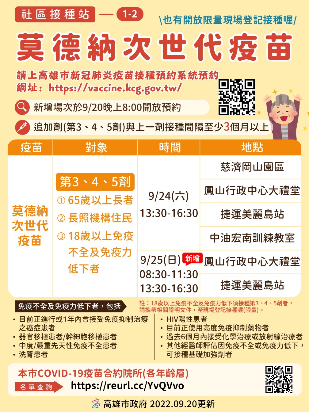 南部新聞高雄市【衛生局】9/20更新莫德納次世代疫苗社區接種站