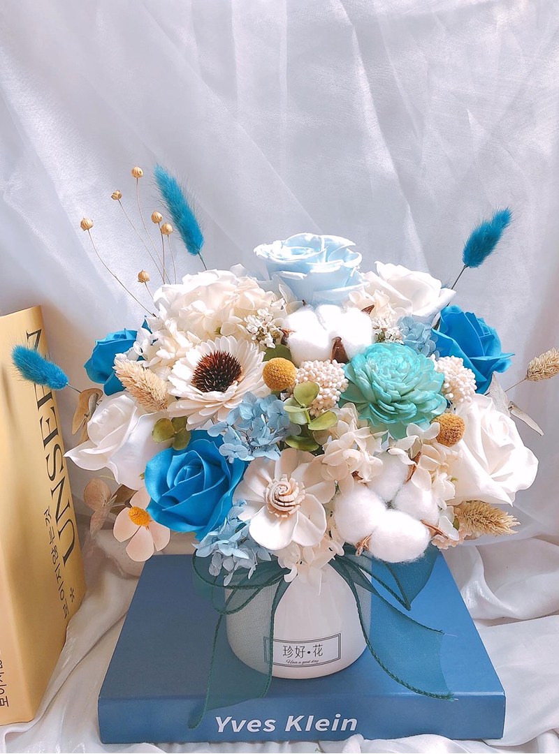 永生花就是所謂的不凋花,同樣是以鮮花製作,首先將花浸泡到脫水、脫色的溶液裡面,再經過染色而成,所以它的觸感幾乎會跟鮮花一樣,且顏色依然鮮豔,在沒有碰到水、沒有被擠壓,並且避免潮濕跟日曬的情況下,可以保存二年到三年的時間。