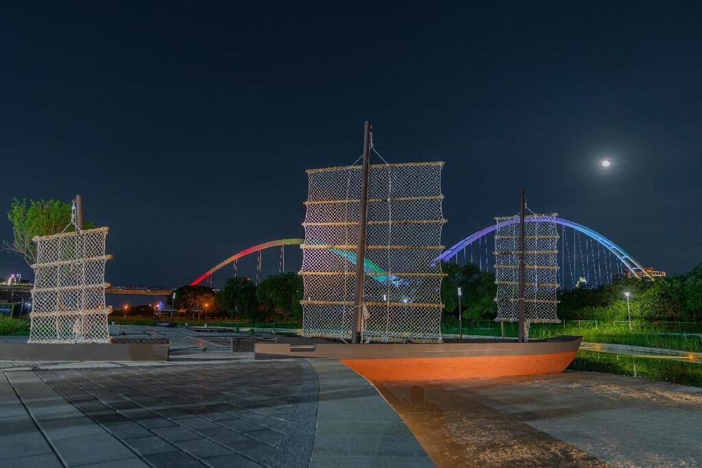 新莊在三百年前有座「新莊港」,是當時北台灣最繁華的城市之一,有「一府、二鹿、三新莊」的美名,亦曾有「千帆林立新莊港」之盛景。高灘處推動「大河之舟」計畫,以「新莊港」的歷史人文為主軸,及新莊古碼頭為意象,連結當地景觀地標-新月橋,於橋下設置新月形淺水池-新月池、文化解說、大河之舟意象、休憩遮蔭設施、帆船地景及生態休憩步道,希望將新莊廟街人潮從新月橋帶入新莊河濱公園,進一步認識新莊文化。