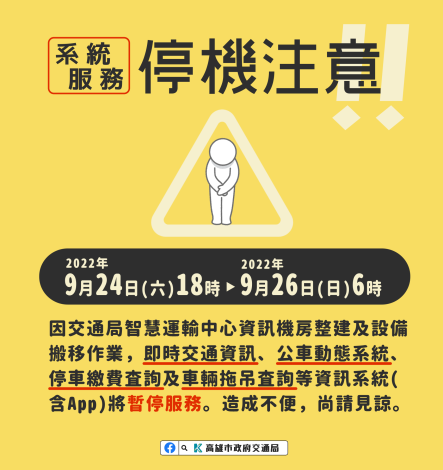 交通局表示,為提供市民朋友更穩定交通資訊服務,交通局智運中心將針對聯合資訊機房進行升級維護。自111年9月24日(六)18時開始停機至26日(一)6時,交通局所屬對外為民服務系統(含網站、語音查詢、站牌跑馬燈、手機APP等)均暫停服務作業。暫停系統服務部分包括: