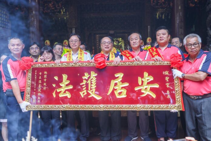 桃園市長張善政今(10)日上午前往蘆竹區,出席「誠聖宮恭祝關聖帝君1864周年聖誕活,並致贈「安居護法」匾額。張市長表示,今日是農曆6月24日,為關聖帝君1864周年聖誕,現場的眾多信眾都懷著虔誠的心,向關聖帝君祈願,為家庭、桃園與國家祈福。