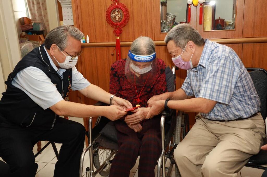 重陽佳節將至,台中市政府每年配合重陽節辦理敬老月系列活動,今年由各區致贈長輩重陽節禮金拉開序幕,表達對台中長者最崇高的敬意,副市長令狐榮達今(22)日代表市長盧秀燕探訪高齡101歲的武曹光如女士,致贈市府重陽禮金1萬元,並轉贈總統府及衛生福利部重陽賀禮金鎖片,祝福奶奶重陽快樂,長壽又健康。