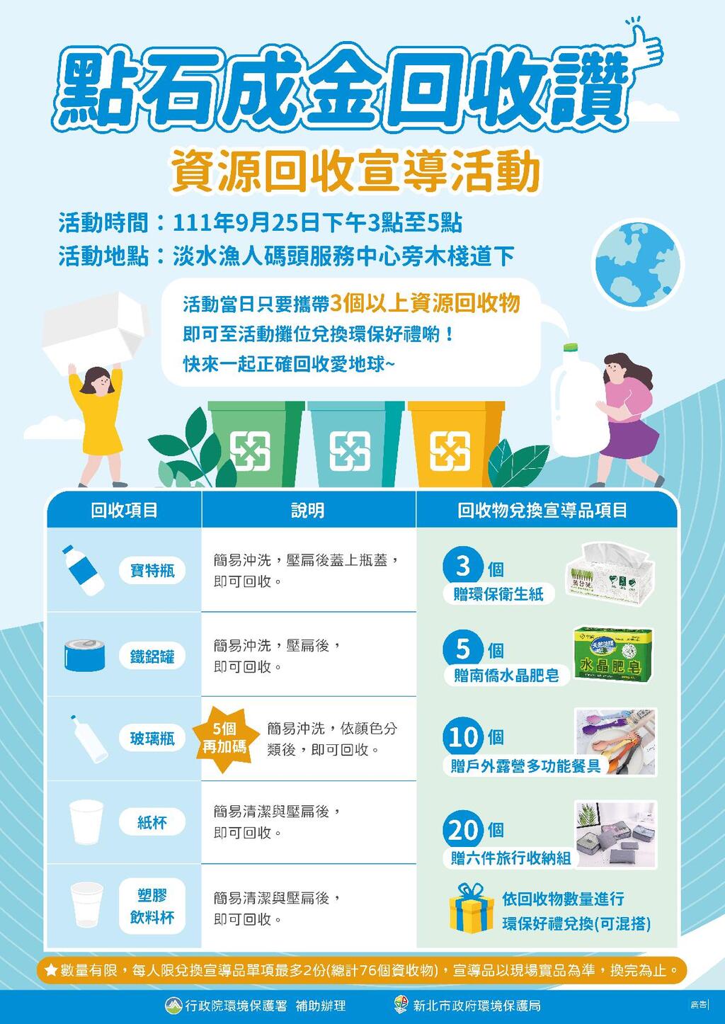 新北市環保局將於9月25日下午於淡水漁人碼頭辦理「點石成金回收讚,資源回收宣導活動」,除了傳達正確的分類回收方式外,現場民眾只要回收正確,即可兌換各種環保實用好禮,歡迎共襄盛舉!