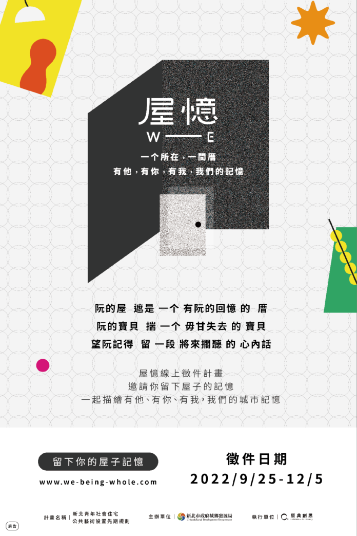 城鄉發展局於111年9月25日至111年12月5日公開受理《屋憶W—E徵件計畫》,本計畫是新北市社宅公共藝術先期規劃的暖身活動,以《屋憶W—E》命名此藝術行動,象徵「對屋子的記憶」及「WE我們」的雙重意涵,「BEING WHOLE做伙」的公共藝術臉書粉專也同步上線,歡迎市民朋友參與徵件,共創出屬於我們的城市記憶,型塑BEING WHOLE好做伙的社宅文化新願景。
