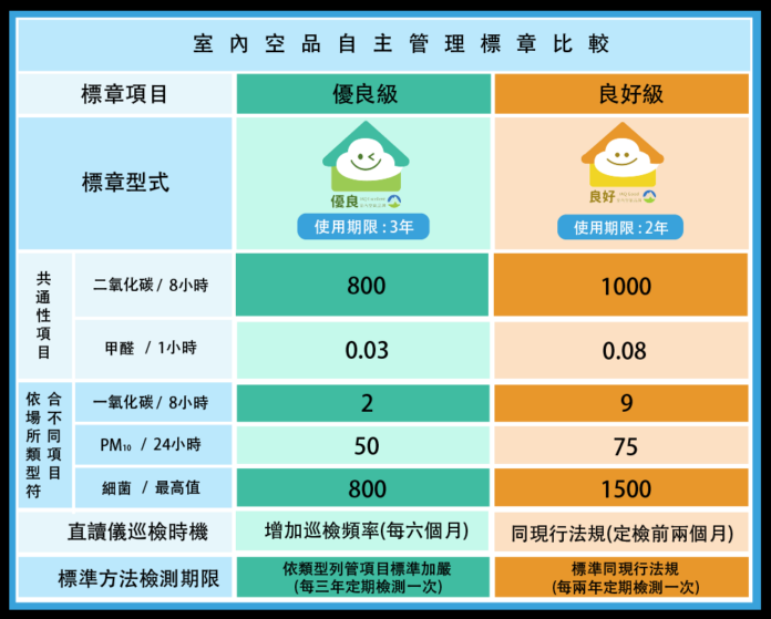 此外,為鼓勵公私場所取得優良級標章,除可獲得環保綠點及提升企業形象外,場所提供休閒或消費皆有益提升民眾滿意度;另針對台中市應符合室內空氣品質管理法的公告場所,若自主由良好級標章提升為優良級標章,其定期檢測頻率可延長為3年1次及減少採樣點數降低維護管理成本,並提升企業良好形象外;而環保局也會不定期追蹤查核及室內空品檢測,以了解各場所落實程度,維護公眾健康。
