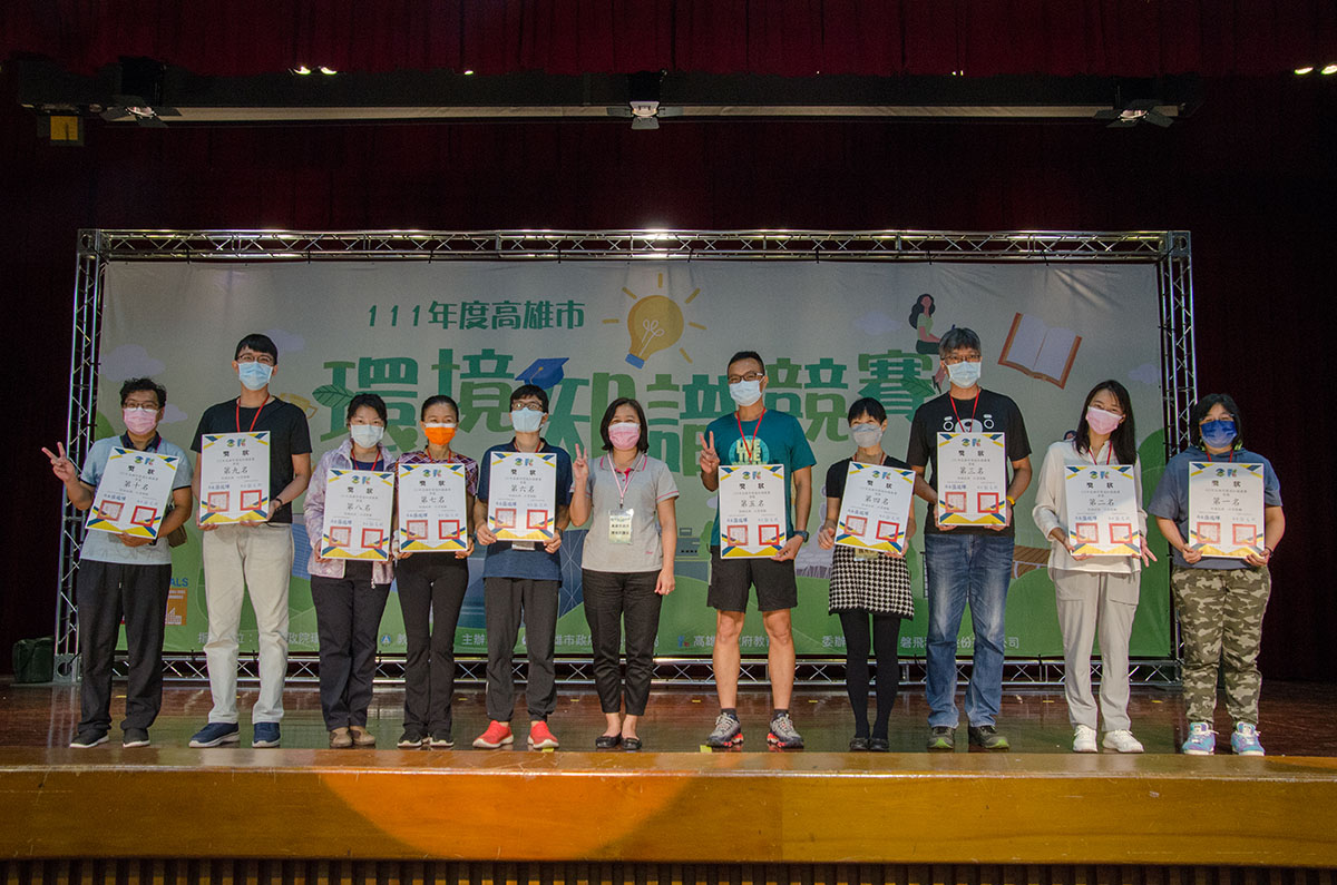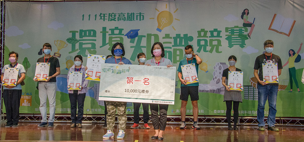 本次高雄市環境知識競賽得獎名單公布,國小組第一名博愛國小郭仁爵同學、國中組第一名瑞祥高中國中部曹芸甄同學、高中(職)組第一名楠梓高中林永涵同學、社會組第一名馬宜平小姐,各組別第一名至第十名分別獲得一萬元至五百元之獎勵禮券,各組前五名將代表高雄市參加環保署辦理的「全國環境知識競賽總決賽」,與來自各縣市環境知識菁英高手過招。