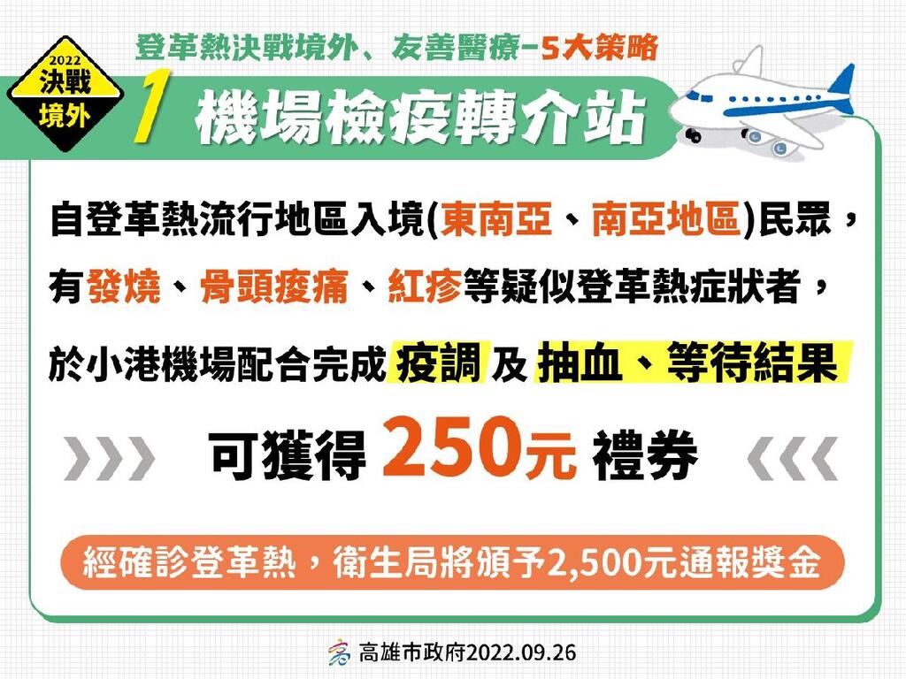一、機場檢疫轉介站:自登革熱流行地區入境民眾,有發燒、骨頭痠痛、紅疹等疑似登革熱症狀者,配合疫調工作並抽血,可獲得250元禮券。