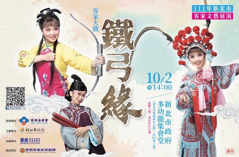 為推廣客家戲曲藝術文化,新北市政府客家事務局特別辦理111年新北市客家文藝展演活動,邀請榮興客家採茶劇團於10月2日下午2點,在新北市政府3樓多功能集會堂展演客家大戲《鐵弓緣》,除了演繹多元且精緻的客家戲曲風貌,更希望能讓都會區鮮少有機會欣賞客家戲曲的朋友,一同欣賞客家採茶戲的精緻與豐富。