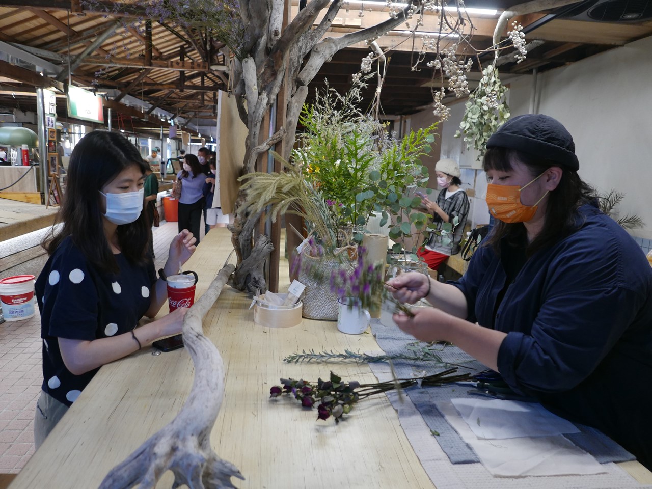 目前仍在百貨業兼職的川草負責人鬆獅說,自己有逛花市習慣,也對花草擺設有興趣,2019年開始就在市集擺攤,很喜歡市場環境,且傳統市場常見入口首攤就是有攤商賣鮮花,認為在鹽一市場賣鮮花、乾燥花沒有什麼違和,且生意意外還蠻好的。未來將與市場內做餐點、甜點或披薩等攤位合作搭配花材設計,且目前攤位設置櫥窗展示也幫整座市場做美化。
