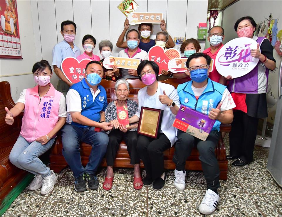 彰化縣王惠美縣長於重陽節前夕特地向百歲人瑞祝賀,於今(27)日早上與員林市長游振雄等民代,前往拜訪人瑞張龛阿嬤,王縣長與張阿嬤相見歡,並致贈人瑞重陽禮金1萬元、金鎖片2錢、敬老狀及禮品,表達對於人瑞敬重關懷之意,同時也祝福所有人瑞健康、平安。