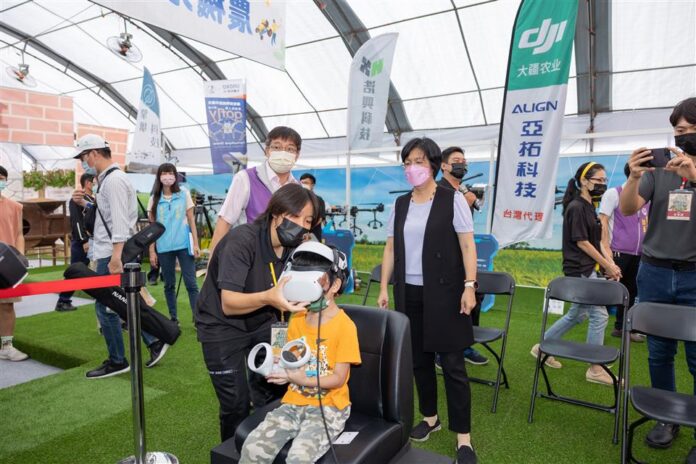 「2022中臺灣農業行銷暨園藝資材博覽會」從9月24日起到10月2日在彰化溪州公園盛大展開,活動園區規劃7大展區,除了集結中台灣彰化、臺中、南投、苗栗及雲林五縣市優質農產品,更與明道大學、工研院及在地農友合作,規劃以節能、環保、減碳及寓教於樂的主題展館「智慧及循環農業展」,由農機時光廊道做為入口意象、介紹農機的演進從西元前到現代,進去後映入眼簾的是最夯的元宇宙元素,有曳引機VR操作體驗,讓平常不容易接觸農機具的參觀民眾,能夠實際體驗操控農機具,並利用小型無人機實際體驗耕作小型農場、還有並從中了解到大型的農機具如何去協助農友進行省工、省時、省力的栽培管理。