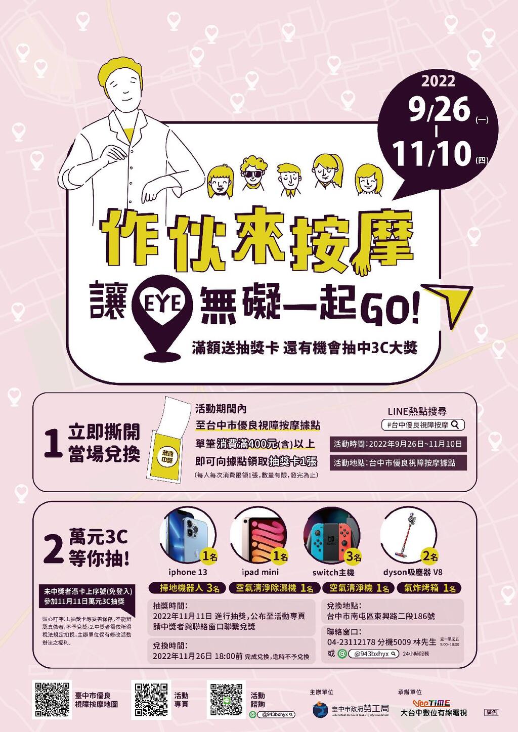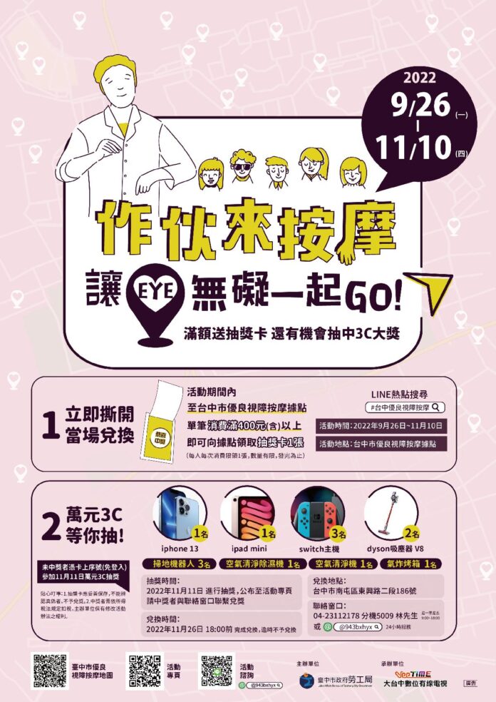 111年度台中市優良視障按摩據點行銷活動開跑!自即日起至11月10日止,民眾只要到「台中市優良視障按摩據點」單筆消費滿400元以上,就可獲得抽獎卡1張,立即撕開、當場兌換,沒中還有機會參加抽獎,抽iPhone13、iPad mini、Switch、Dyson無線吸塵器等多項大獎,中獎率高,數量有限發完為止,快找親朋好友作伙來按摩,健康、紓壓順便抽萬元3C!