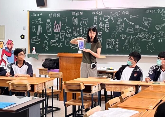 大明高中校長吳原榮分享,透過學校美術、生物、英語科老師們組成跨領域團隊,帶領學生們經由訪談、紀錄、溝通、攝影、空間營造及版畫製作等教學活動,探討垃圾場凌亂現象,嘗試解決堆積物過多的問題,從中建立起學生對環境的歸屬與認同感,培養學校師生以創新思維解決環境的難題。(9/29*7)*教育局
