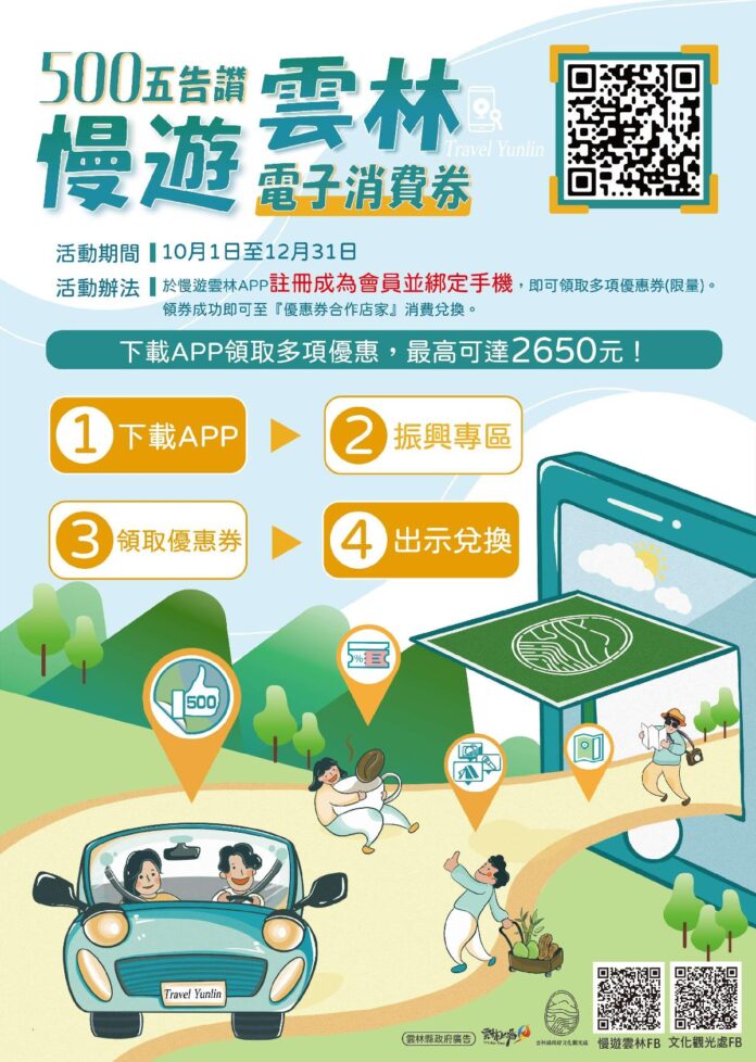 雲林縣政府推出的「慢遊雲林5百五告讚」系列活動中,最受矚目之優惠券補助將於10月1日起開跑,10月1日起下載「慢遊雲林」APP並綁定會員,可領取包含消費券、住宿券、租車券及咖啡券等多張線上優惠票券,總補助額最高可達2650元!