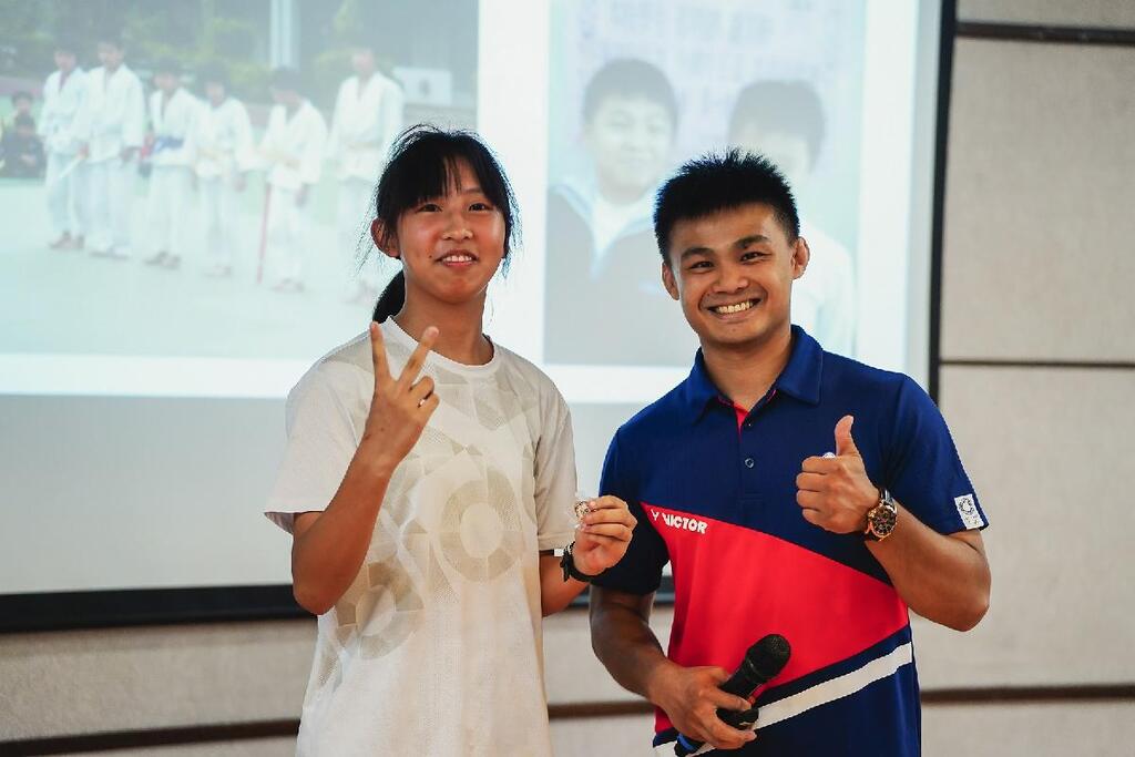 目前於國立體育大學擔任教練的柔道國手蔡明諺,講座中分享自身從受傷、治療、復出參賽到轉換身分參加東京奧運的歷程,認為「把熱愛的事情做到極致,就會變成價值」,他更提醒小選手們「不要放棄學業,他是能讓我們未來擁有更多選擇機會的保障」。