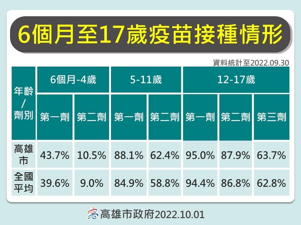 南部新聞高雄市【衛生局】10/1更新6個月至17歲疫苗接種情形
