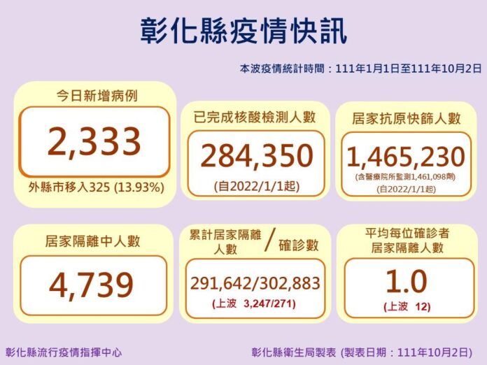 中部新聞彰化縣10月2日防疫說明 彰化縣新增2333例 仍不能鬆懈 中部新聞彰化縣 10月2日防疫說明 彰化縣新增2333例 仍不能鬆懈 編輯 大慶 張 2022-10-02 彰化縣10月2日防疫說明,縣長王惠美表示,彰化縣今天新增2,333例,未列案號4例,與中央一致,防疫仍不能鬆懈,自今年起已完成核酸檢測人數28萬4,350人,居家抗原快篩人數146萬5,230人,居家隔離中人數4,739人,累計居家隔離人數29萬1,642人,確診數30萬2,883人,平均每位確診者居家隔離人數1人,提醒大家,仍要落實防疫,勤洗手、戴口罩,保持社交距離,一起守護健康家園。 延伸閱讀 商情 台北日立大金電器維修-全省日立冷氣故障維修、新北大金冷氣維修 商情 和庭行疊蓆–新北台北塌塌米訂做坐墊專賣、新北和室紙門障仔門紙 商情 鴻盛裝潢工程行–台南安平工程統包、台南室內裝潢、台南室內裝修 商情 樺麟 專業製造螢光棒LED應援商品滿足全台活動需求