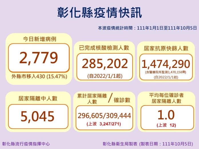中部新聞彰化縣10月5日防疫說明 彰化縣新增2779例 防疫仍不能鬆懈 中部新聞彰化縣 10月5日防疫說明 彰化縣新增2779例 防疫仍不能鬆懈 編輯 大慶 張 2022-10-05 彰化縣10月5日防疫說明,縣長王惠美表示,彰化縣今天新增2,779例,未列案號2例,防疫仍不能鬆懈,自今年起已完成核酸檢測人數28萬5,202人,居家抗原快篩人數147萬4,290人,居家隔離中人數5,045人,累計居家隔離人數29萬6,605人,確診數30萬9,444人,平均每位確診者居家隔離人數1人,提醒大家,仍要落實防疫,勤洗手、戴口罩,保持社交距離,一起守護健康家園。 延伸閱讀 商情 生洋網路榮獲「國家品牌玉山獎」以獨創 AIAS 飛輪策略協助品牌突圍,打造可驗證的永續成長新模式 商情 台北日立大金電器維修-全省日立冷氣故障維修、新北大金冷氣維修 商情 和庭行疊蓆–新北台北塌塌米訂做坐墊專賣、新北和室紙門障仔門紙 商情 鴻盛裝潢工程行–台南安平工程統包、台南室內裝潢、台南室內裝修