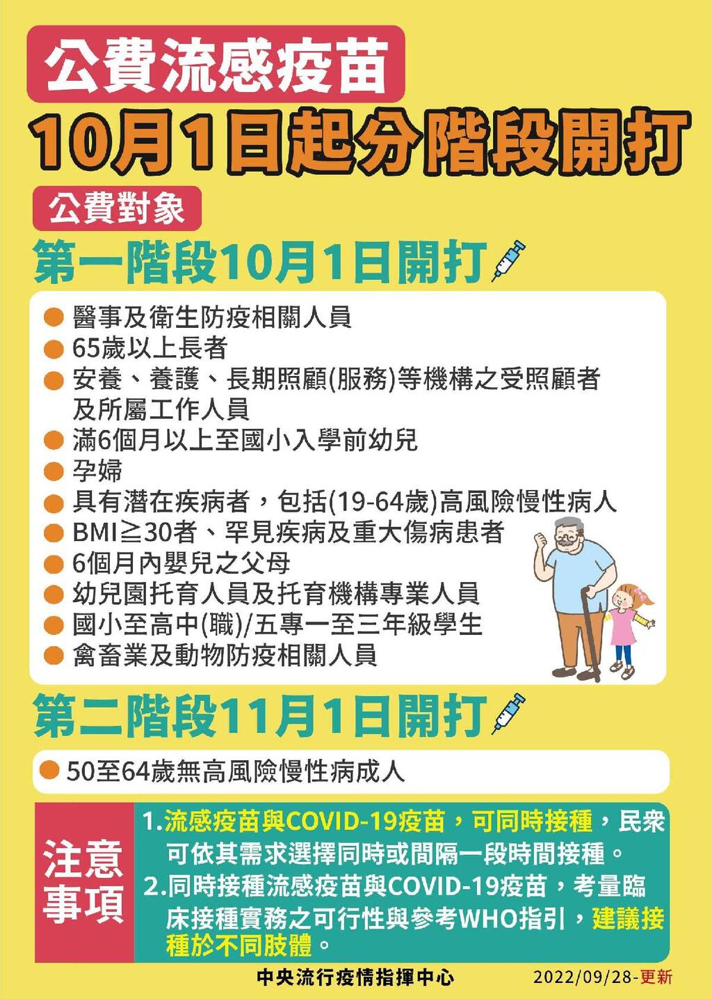 配合中央政策,本縣今年度公費流感疫苗分兩階段開打,第一階段自 10 月 1 日起開打,對象包括「醫事及衛生防疫相關人員、65 歲以上長者、安養、養護、長期照顧(服務) 等機構之受照顧者及所屬工作人員、滿 6 個月以上至國小入學前幼兒、孕婦、具有潛在疾 病之高風險慢性病人、BMI≧30 者與罕見疾病及重大傷病患者、國小至高中(職)/五專一至三年級學生、6 個月內嬰兒之父母、幼兒園托育人員及托育機構專業人員、禽畜業及動物防疫相關人員等 11 類對象」;第二階段於 11 月 1 日開打,對象為「50 至 64 歲無高風險慢性病成人」。請符合公費接種資格的鄉親儘速預約接種,且亦可與 COVID-19 疫苗同時接 種。
