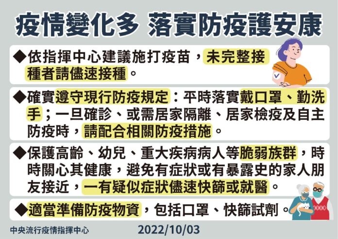 衛生局呼籲,請鄉親千萬不要防疫疲乏,仍要持續遵守政府各項防疫措施,並維持個 人衛生好習慣,勤洗手、戴口罩、完整接種疫苗、保持社交距離,減少不必要移動、活動 或集會,避免出入人多擁擠場所或高感染傳播風險場域,出入公共場域落實手部消毒、體 溫量測等相關措施,下載並使用「臺灣社交距離 APP」,一起守護鄉親健康。