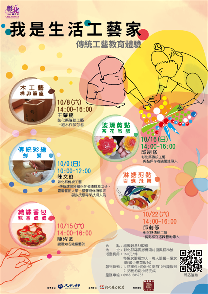 為善用地方文化館多元化社會教育功能,推動並保障人民平等的文化參與及文化近用權,邀請在地傳統工藝保存者或工藝家,策劃工藝體驗活動,內容包括木工藝、彩繪、織繡、剪黏等,藉由生活化的創作內容,推廣傳統技藝,以參與式、動手做等交流,提升工藝展覽館與民眾的互動與工藝知識傳遞,因場地考量活動於福興穀倉B館2樓舉辦。