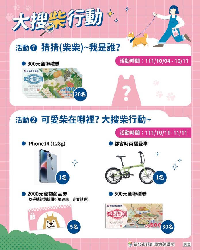 環保局說明,10月4日起「新北i環保」Facebook粉絲專頁將展開兩階段線上宣導活動,帶領市民一起探索住家附近的「新北可愛柴」狗便袋箱,民眾只要上「新北i環保」粉絲專頁依貼文指定步驟按讚、留言、拍照上傳,就有機會獲得iPhone14(128G)、摺疊腳踏車、寵物商品券、賣場禮券等多項好禮,兩階段活動總計有57個得獎機會,歡迎民眾踴躍參加。