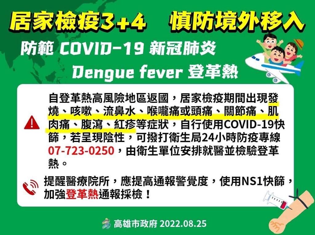 目前東南亞登革熱疫情持續攀升,衛生局持續以簡訊關懷自登革熱高風險地區返國之民眾,居家檢疫期間出現發燒、咳嗽、流鼻水、喉嚨痛或頭痛、關節痛、肌肉痛、腹瀉、紅疹等症狀,自行使用COVID-19快篩,若呈現陰性,可撥打衛生局24小時防疫專線07-723-0250,由衛生單位安排就醫並檢驗登革熱。具登革熱疑似症狀且符合自流行地區入境本市之民眾,發病2日內主動通報本市衛生單位,並配合本市衛生局進行後續採檢、通報、疫調等防疫工作者,頒發防疫禮券300元,無症狀之市民檢疫期滿3日內,主動到本市衛生所採檢,頒發防疫禮券300元,經確診,衛生局將頒發現金2,500元獎勵。