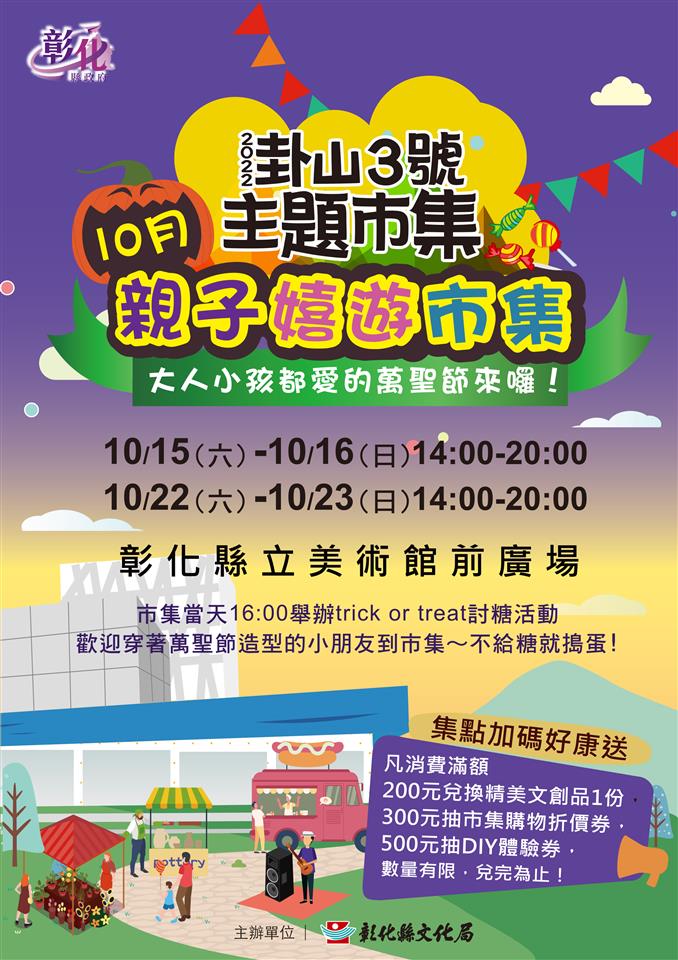 不給糖,就搗蛋!「2022卦山3號主題市集」10月份推出的「親子嬉遊市集」搭配即將到來的萬聖節,在10月15日、16日、22日、23日,一連兩周的周末日下午1點至晚間7點於彰化縣立美術館前廣場歡樂開賣,歡迎大家前來同樂。