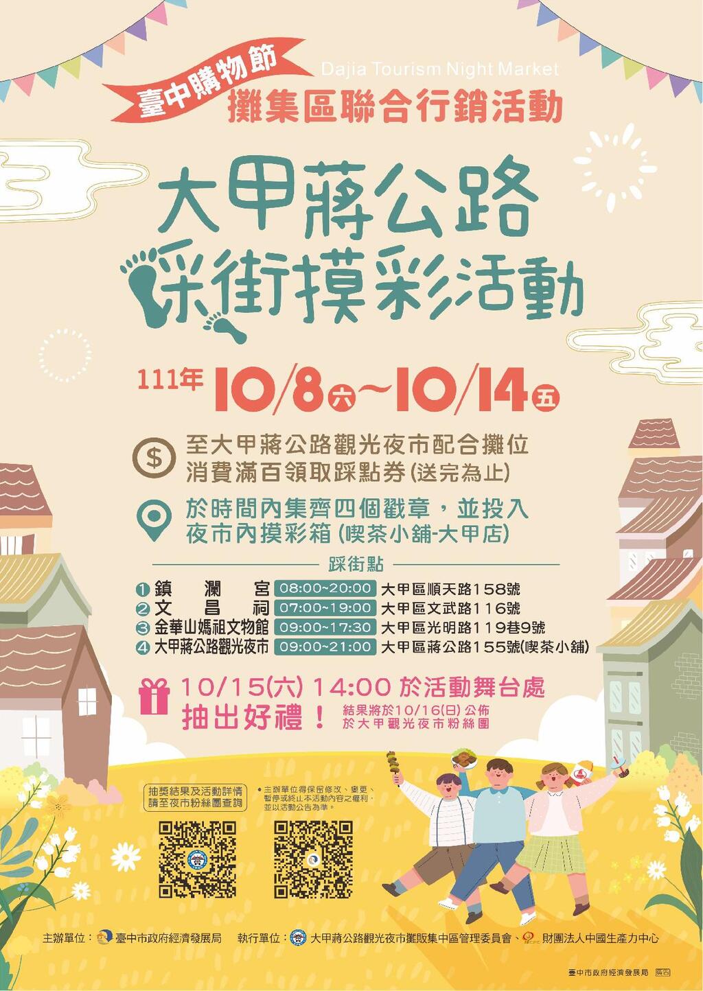另外,為促進夜市觀光,市府經發局加碼推出「大甲蔣公路踩街摸彩活動」,自明日起,民眾只要在大甲蔣公路觀光夜市所屬攤位消費滿百,即可向攤商免費索取踩點券,在10月14日前蒐集完成夜市與周邊景點共4處戳章,包括大甲鎮瀾宮、大甲文昌祠、金華山媽祖文物館和大甲蔣公路觀光夜市,就可參加摸彩。