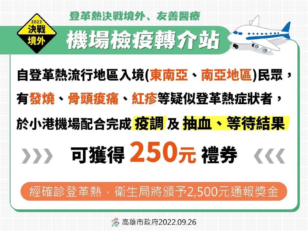 在決戰境外部分,呼籲自登革熱流行地區(東南亞/南亞)入境小港機場且出現登革熱相關症狀者,通關時務必主動告知機場檢疫人員進行採檢,現場配合完成採檢,衛生局將頒贈250元禮券。進入社區居家檢疫時,如出現發燒、頭痛、骨頭肌肉痠痛、腹瀉、皮膚出紅疹,請務必撥打衛生局24小時防疫專線07-7230250,由防疫人員安排就醫採檢。發病2日內主動通報衛生單位,並配合採檢、通報、疫調等防疫工作者,將頒贈防疫禮券300元;如為身份為國際移工(或漁工)完成上述通報工作,協助就醫之仲介(或雇主),再頒贈防疫禮券300元;無症狀之市民檢疫期滿3日內主動到本市衛生所採檢,衛生局亦頒贈防疫禮券300元,請市民朋友全力配合防疫,防範病毒入侵社區家庭。