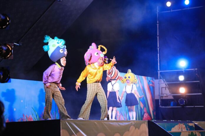 深受大小朋友喜愛的紙風車劇團,今(7)晚於龍山國小帶來著名劇碼「巫頂環遊世界」,劇後還有親子遊戲競賽「海底世界運動會」,由市長盧秀燕擔任裁判,上千名大小朋友巧扮海草隨音樂搖擺,各魚類選手在民眾推移中奮力比賽,逗樂現場觀眾,氣氛熱鬧歡騰,最終由海豚勇奪第一,海龜則在眾人加油聲中返回終點。