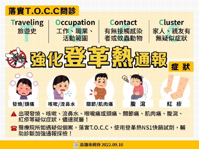 衛生局提醒,此波疫情警戒範圍包含前鎮16里(瑞豐、竹內、竹南、瑞竹、瑞南、瑞北、瑞西、瑞祥、瑞興、瑞崗、瑞東、瑞平、瑞華、瑞昌、瑞隆、瑞和里及鳳山3里(善美、正義、新武里),請民眾提高警覺若出現發燒、頭痛、後眼窩痛、肌肉關節痛、出疹等疑似症狀症狀,應儘速就醫,籲請醫療院所診察時加強TOCC問診,針對不明原因發燒之民眾,若COVID-19快篩陰性,應再與登革熱及流感鑑別診斷,以縮短「隱藏期」(個案發病至通報時間),及早診斷,及早通報,早期介入防治工作。