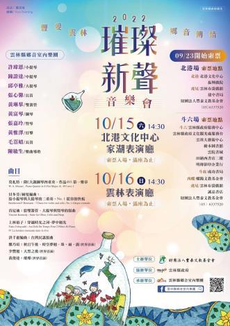睽違近三年的雲林縣鄉音室內樂團於10月15、16日下午兩點半分別在北港文化中心家湖廳與雲林表演廳演出「豐愛雲林 鄉音傳情《璀璨新聲》」音樂會。雲林縣鄉音室內樂團將為雲林鄉親再度展現精湛技巧,從二重奏到八重奏,搭配知性與感性的樂曲導聆,提供愛樂者藝文生活新體驗,享受一個難以忘懷的秋日午後。