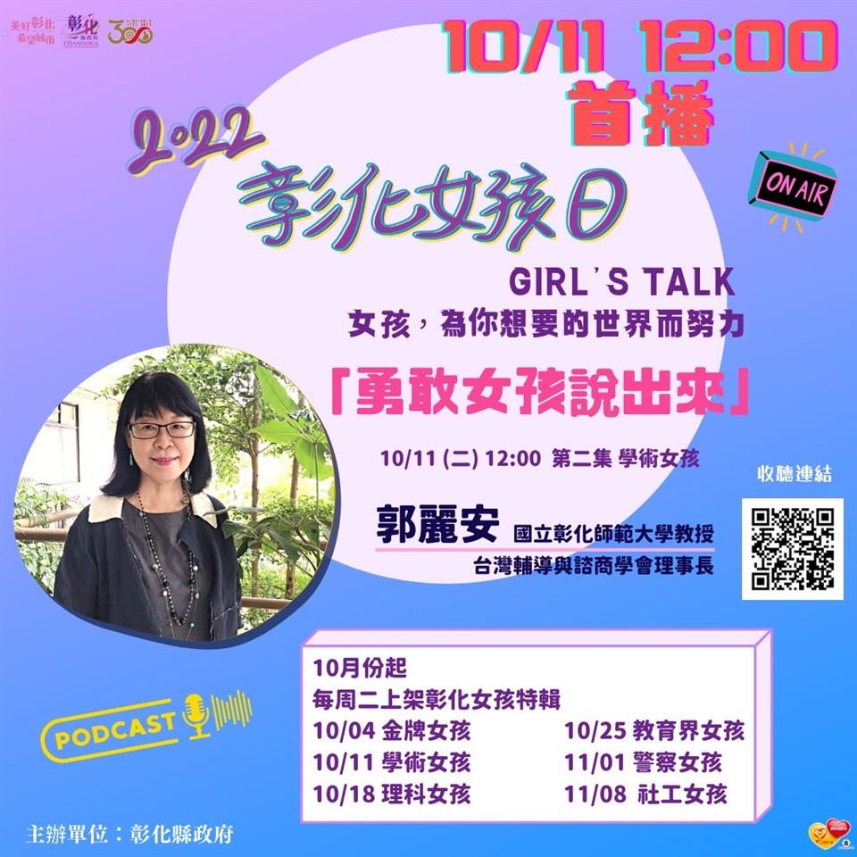 📣「勇敢女孩,說出來」勇敢女孩故事第二集出爐囉~即日起請鎖定~「彰化囝仔廣播站」Podcast頻道(收聽連https://open.firstory.me/user/cl6bvk1jm000001uxbqf946mg/platforms )每周二上架一集彰化女孩特輯,邀請您一起搶先聽 第二集「學術女孩 郭麗安」📢