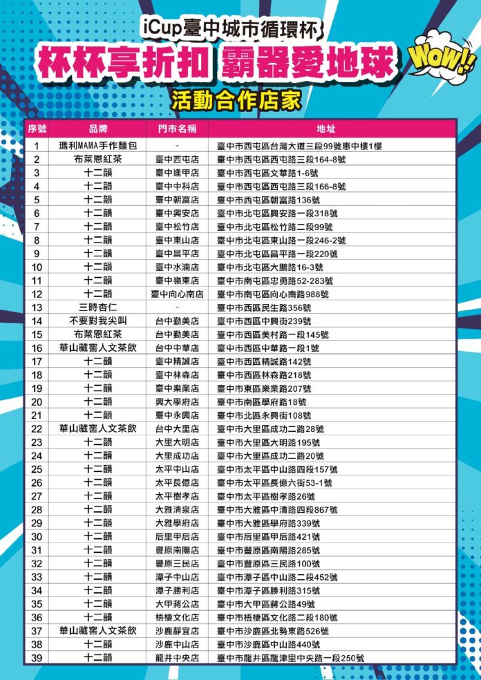 環保局表示,活動詳情可至「杯杯享折扣 霸器愛地球」活動專頁(https://loopick.com.tw/taichung-icup/)、環保局資源回收網(https://recycle.epb.taichung.gov.tw/)及「台中好環保」臉書粉絲專頁(https://www.facebook.com/recycle.tcepb)查詢。(10/12*16)*環保局