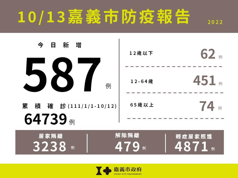 中央流行疫情指揮中心今(10/13)日公布全國本土新增53356例,嘉義市新增587例確診個案,包含12歲以下62例,12-64歲451例,65歲以上74例。嘉義市目前居隔3238人,解隔479人,輕症居家照護人數4871人。111/1/1截至111/10/12嘉義市累計確診嚴重特殊傳染性肺炎本土病例數為64739人。截至10/12本市接種5至未滿12歲兒童接種率:16670人(95.61%)。 今(10/13)日起邊境管制放寬為「0+7」,請民眾遵守自主防疫措施及自主防疫期間醫療防疫規範;如快篩陽性應儘速就醫,建議以遠距/視訊診療等方式評估快篩陽性結果及通報,確診後,如有就醫需求,可自行開車、騎車、步行、家人親友載送(雙方全程佩戴口罩)就醫,請勿搭乘大眾運輸工具前往,以降低疾病傳播風險,共同維護社區安全。詳情可至COVID-19入境檢疫及醫療資訊網查詢(https://www.cdc.gov.tw/ArrivalQuarantine/info_1013.html)。 目前仍處於BA.5社區流行疫情高原期,依據臨床試驗顯示,含有原始株及BA.1變異株之雙價疫苗相較於單價疫苗,對於抵抗Omicron變異株有較佳的保護力,目前已開放18歲以上民眾可接種莫德納次世代雙價疫苗作為「追加劑」來強化疫苗保護力,請符合民眾盡速完成接種,以降低感染後重症及死亡的風險。相關接種訊息請至衛生局網站/主題專區/COVID-19疫苗接種資訊專區(https://health.chiayi.gov.tw/cp.aspx?n=7501)查詢。 衛生局呼籲,接種疫苗是面對疫情回復生活正常的重要環節,也請民眾持續落實手部衛生、咳嗽禮節及佩戴口罩等個人防護措施,避免出入人多擁擠的場所,或高感染傳播風險場域,共同嚴守社區防線。 另,衛生局提醒,嘉義市免費C肝篩檢活動於10/15、10/30兩天假日尚有共3場次社區篩檢,歡迎設籍嘉義市且年滿30歲未曾篩檢過者,善用資源篩檢,另周一至周五上午8:30-11:30也可至本市東、西區衛生所檢查,接受篩檢請全程佩戴口罩,保持安全社交距離。