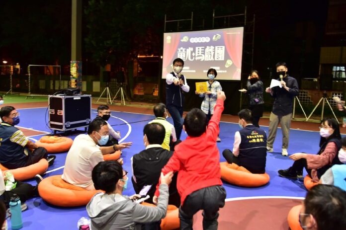 台中市政府客委會與東勢區中山國小昨(12)晚在中山國小新落成的禾埕球場舉行夜間電影院放映活動,放映榮獲2021年烏克蘭兒童影展的最佳影片法國電影「童心馬戲團」,現場約150人參與,氣氛熱絡。市府客委會主委江俊龍表示,透過「客庄禾埕場域建置計畫」的禾埕球場能被多元運用,感到非常欣喜。