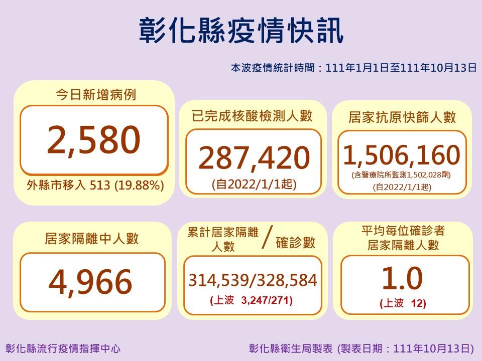中部新聞彰化縣10月13日防疫說明 彰化縣新增2580例 防疫仍不能鬆懈 中部新聞彰化縣 10月13日防疫說明 彰化縣新增2580例 防疫仍不能鬆懈 編輯 大慶 張 2022-10-13 彰化縣10月13日防疫說明,縣長王惠美表示,彰化縣今天新增2,580例,未列案號5例,與中央一致,自今年起已完成核酸檢測人數28萬7,420人,居家抗原快篩人數150萬6,160人,居家隔離中人數4,966人,累計居家隔離人數31萬4,539人,確診數32萬8,584人,平均每位確診者居家隔離人數1人,提醒大家,仍要落實防疫,勤洗手、戴口罩,保持社交距離,一起守護健康家園。 延伸閱讀 商情 生洋網路榮獲「國家品牌玉山獎」以獨創 AIAS 飛輪策略協助品牌突圍,打造可驗證的永續成長新模式 商情 台北日立大金電器維修-全省日立冷氣故障維修、新北大金冷氣維修 商情 和庭行疊蓆–新北台北塌塌米訂做坐墊專賣、新北和室紙門障仔門紙 商情 鴻盛裝潢工程行–台南安平工程統包、台南室內裝潢、台南室內裝修