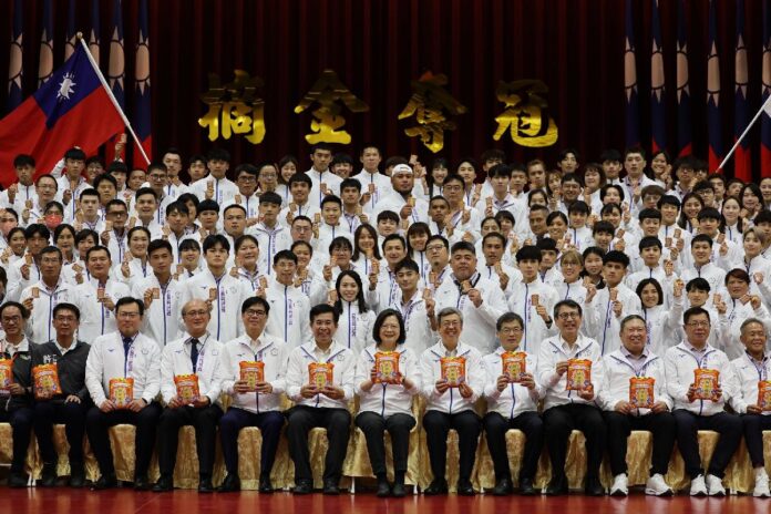 蔡英文總統今(16)日前往國家運動訓練中心,親自為我國參加「第19屆杭州亞洲運動會」代表團授旗及勗勉教練與選手,並致贈30萬元加菜金,為國家隊加油打氣及祝福代表團參賽順利、續創佳績。