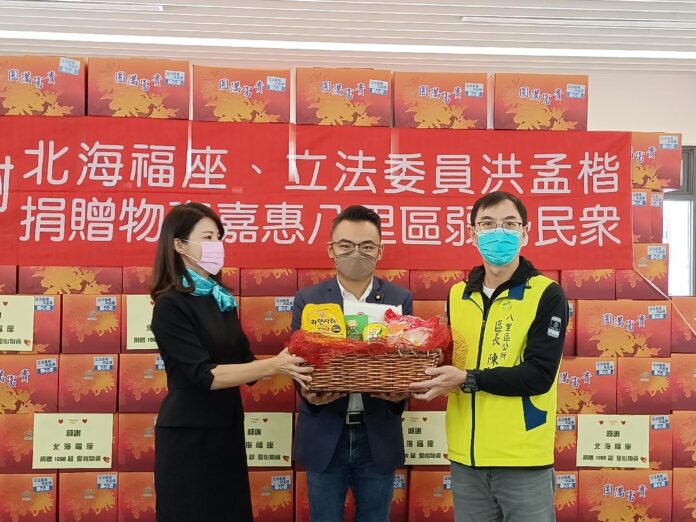 立法委員洪孟楷連續兩年攜手國寶集團「北海福座」捐贈1,000箱價值50萬元的民生物資予八里區弱勢民眾,今(14)日於八里區公所舉辦愛心物資捐贈儀式,並透過八里區公所及各里里長將千箱愛心物資,送到低收入戶、中低收入戶等弱勢族群約750戶及境內愛維養護中心、樂山教養院及華山基金會等社會福利機構,善盡社會責任,為疫情衝擊之弱勢族群增添一股溫暖。