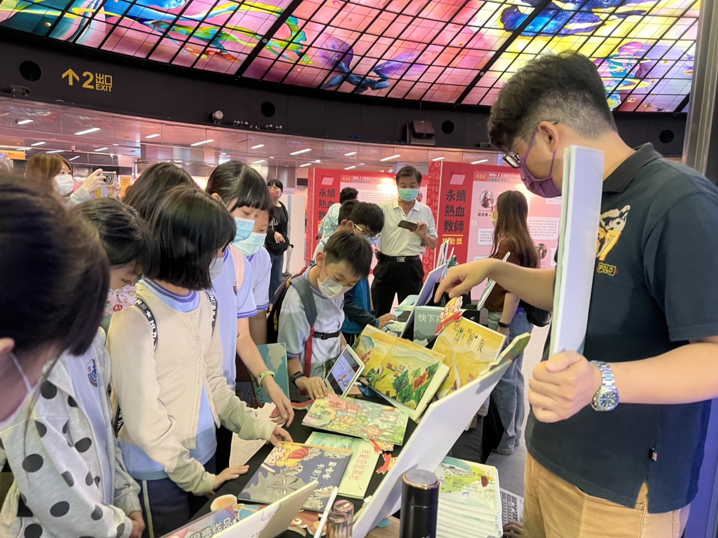10月14日假美麗島捷運站穹頂大廳的環境教育成果展,除供市民駐攤閱讀賞析111年環境教育繪本故事冊外,現場還有固定時段由環保局志工媽媽說故事,吸引大朋友小朋友開心駐足舞台區聽繪本故事。當日亦邀請環境教育繪本得獎作者們蒞臨現場,並由環保局張瑞琿局長頒發獎狀,將得獎喜悅與現場民眾分享,此次繪本展出作品,除今年得獎的環境教育繪本作品於高雄美麗島捷運站搶先曝光之外,亦將前兩年得獎作品一同亮相。