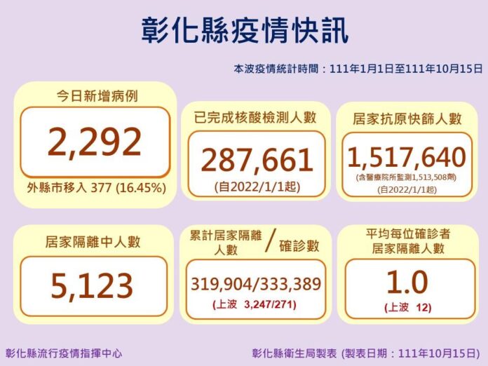 中部新聞彰化縣10月15日防疫說明 彰化縣新增2292例 防疫仍不能鬆懈 中部新聞彰化縣 10月15日防疫說明 彰化縣新增2292例 防疫仍不能鬆懈 編輯 大慶 張 2022-10-15 彰化縣10月15日防疫說明,縣長王惠美表示,彰化縣今天新增2,292例,未列案號2例,與中央一致,自今年起已完成核酸檢測人數28萬7,661人,居家抗原快篩人數151萬7,640人,居家隔離中人數5,123人,累計居家隔離人數31萬9,904人,確診數33萬3,389人,平均每位確診者居家隔離人數1人,提醒大家,仍要落實防疫,勤洗手、戴口罩,保持社交距離,一起守護健康家園。 延伸閱讀 商情 生洋網路榮獲「國家品牌玉山獎」以獨創 AIAS 飛輪策略協助品牌突圍,打造可驗證的永續成長新模式 商情 台北日立大金電器維修-全省日立冷氣故障維修、新北大金冷氣維修 商情 和庭行疊蓆–新北台北塌塌米訂做坐墊專賣、新北和室紙門障仔門紙 商情 鴻盛裝潢工程行–台南安平工程統包、台南室內裝潢、台南室內裝修