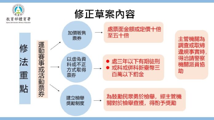 教育部體育署表示,本次審查通過草案重點,包含以行政罰及刑罰併行處罰之條文內容,即除針對超過票面金額或定價販售,按票券張數,處以票面金額10至50倍罰緩之外,亦就蒐集他人身分證統一編號、隨機身分產生器或大量登錄假帳號等購買票券或以外掛程式,如掃票機器人等不正方式大量取得票券此類行為者,處三年以下有期徒刑,或科或併科新臺幣三百萬元以下罰金。主管機關為調查或取締前述違規事實時,得洽請警察機關派員提供協助。此外,為有效杜絕加價販售運動賽事或活動票券之行為,同時也建立檢舉獎勵制度,提高檢舉誘因,並授權訂定辦法完備相關程序及措施,鼓勵民眾勇於檢舉違規事實,共同維護市場秩序。