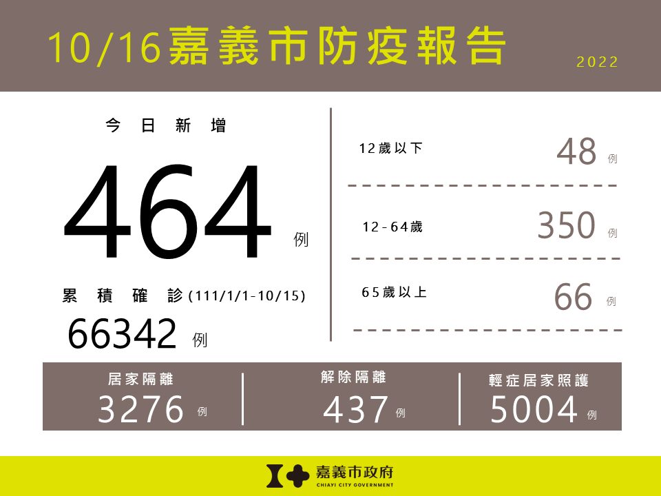中央流行疫情指揮中心今(10/16)日公布全國本土新增41481例,嘉義市新增464例確診個案,包含12歲以下48例,12-64歲350例,65歲以上66例。嘉義市目前居隔3276人,解隔437人,輕症居家照護人數5004人。111/1/1截至111/10/15嘉義市累計確診嚴重特殊傳染性肺炎本土病例數為66342人。截至10/15本市接種5至未滿12歲兒童接種率:16678人(95.65%)。 衛生局提醒市民朋友流感病毒疫苗建議每年須接種1次,以提升防護力,為提升民眾接種可近性,除了流感疫苗合約院所提供接種服務,衛生局由5家醫院於社區展開設站接種服務,目前尚有7場次流感疫苗社區接種站,請民眾盡快接種。此外,年長者易受肺炎鏈球菌侵襲,導致嚴重併發症或死亡的風險,為此衛生局自購6,000劑肺炎鏈球菌疫苗,提供「設籍嘉義市年滿65歲及50-64歲有慢性高風險疾病未曾接種者」免費接種;非設籍嘉義市需年滿71歲未曾接種肺炎鏈球菌疫苗長者,可施打全國公費肺炎鏈球菌疫苗;此疫苗可與流感疫苗同時及分不同部位接種,左手打流感疫苗,右手接種肺炎鏈球菌疫苗,讓保護力更加倍!相關訊息可至衛生局官網/主題專區/流感疫苗專區(https://reurl.cc/MNM1nv)查詢。 另,10月為國際乳癌防治月,希望鼓勵婦女「及早預防、及早發現、及早治療」,依世界衛生組織及實證醫學證明,每2年1次乳房X光攝影檢查,可降低41%乳癌死亡率,請民眾定期參加政府補助的免費癌症篩檢,照顧好健康。另,嘉義市整合性健康篩檢截止至10/31日,請設籍嘉義市之30-39歲市民未曾做過篩檢者或40歲(含)以上市民把握機會篩檢,請務必善用線上預約功能,篩檢前48小時預約,以利人潮分流,疫情期間,入院接受健康篩檢請全程佩戴口罩,保持安全社交距離。